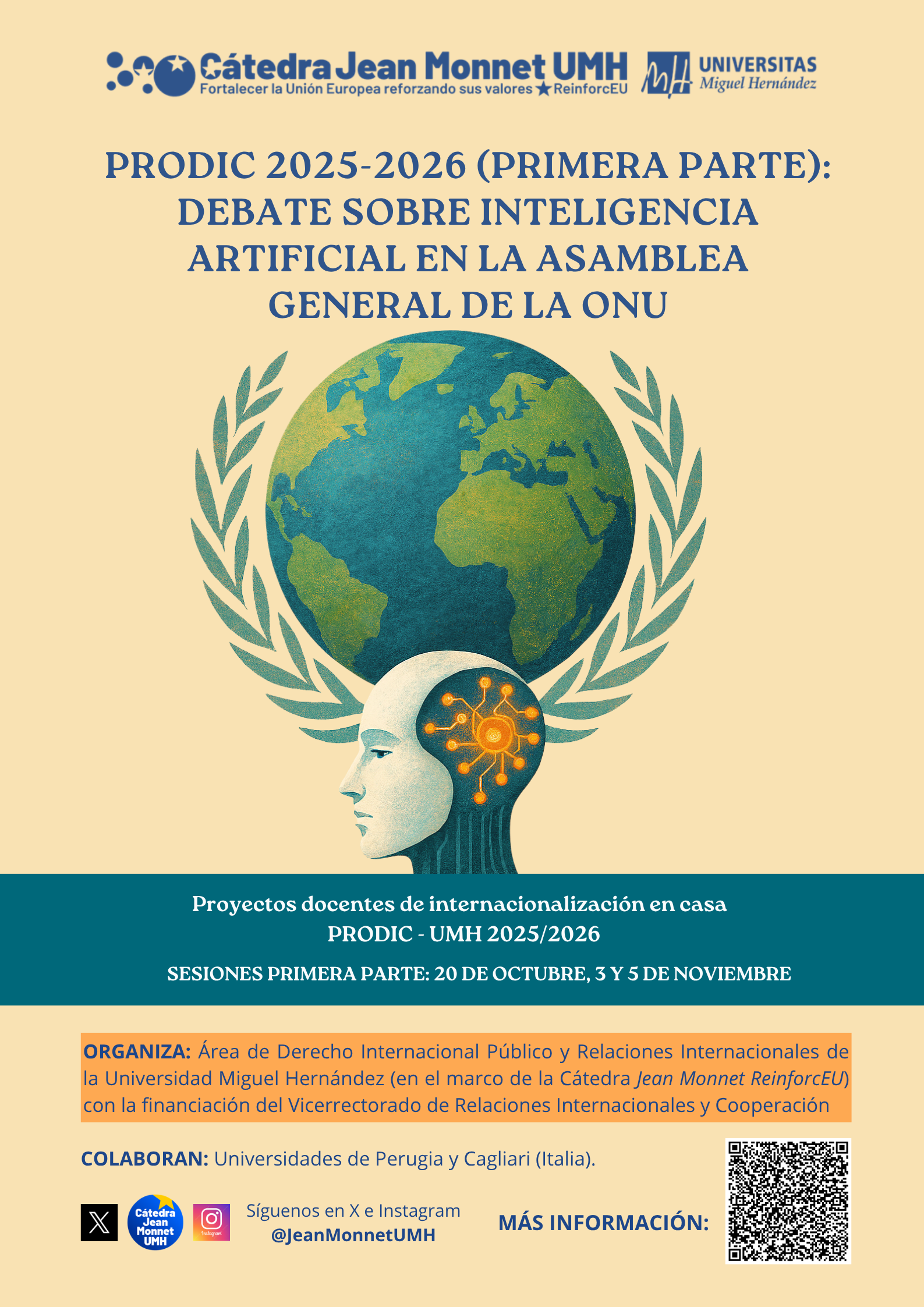 El Área de Derecho Internacional Público y Relaciones Internacionales de la Universidad Miguel Hernández ha puesto en marcha la primera parte del Seminario práctico interuniversitario: Debates sobre Inteligencia Artificial y derechos humanos en la Asamblea General de la ONU y el Parlamento Europeo de la UE, financiado por el Vicerrectorado de Relaciones Internacionales y Cooperación (Proyectos docentes de internacionalización en casa PRODIC-UMH 2025-2026).